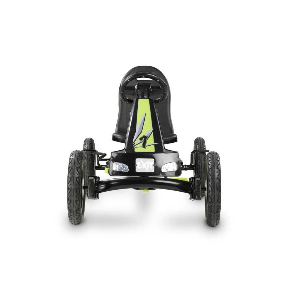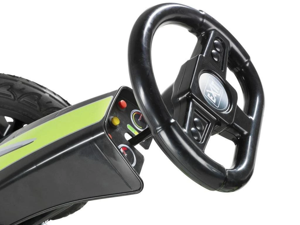 The EXIT Spider is a super cool black/lime green go-kart, completely finished off with thick comfortable pneumatic tyres, sporty wheels and a spoiler. The steering wheel itself is cool, but it also has a place for a sound box with real racing sounds, which is offered as an accessory. The Spider also features headlights and turning signals that are easy to operate from the dashboard. Provide your go-kart with your own name and βnumber plateβ with the supplied set of stickers with letters. And to top it off, there is also a tough handbrake on the go-kart! This makes driving the EXIT Spider even more fun and challenging!
