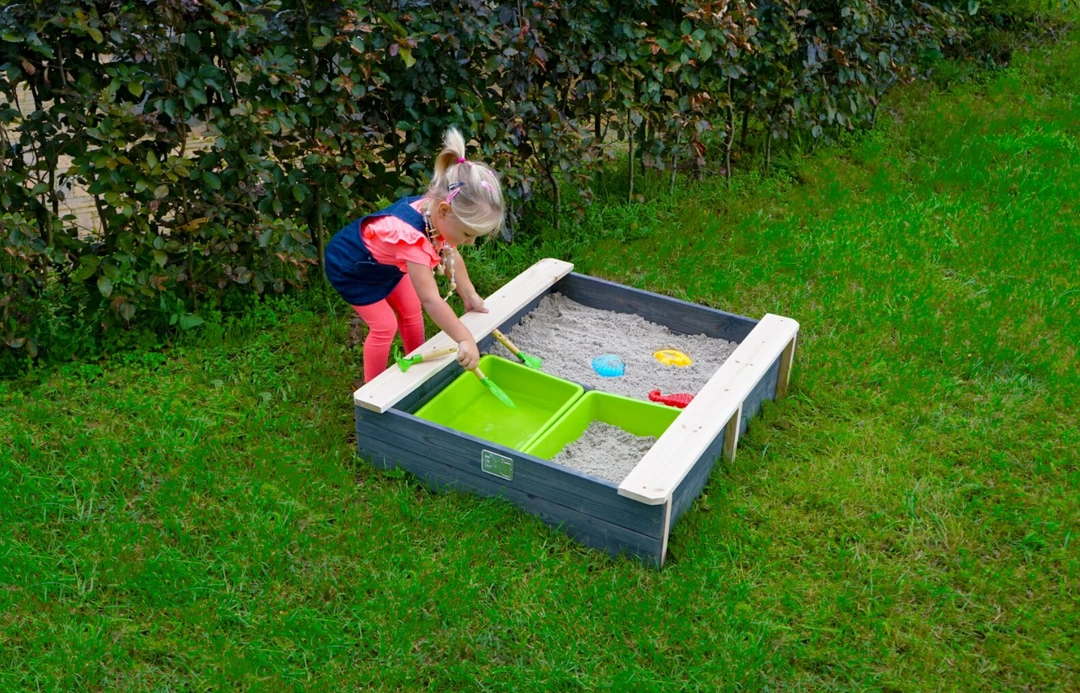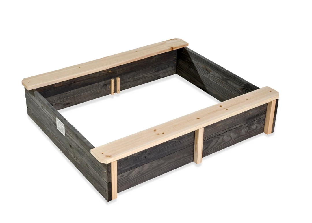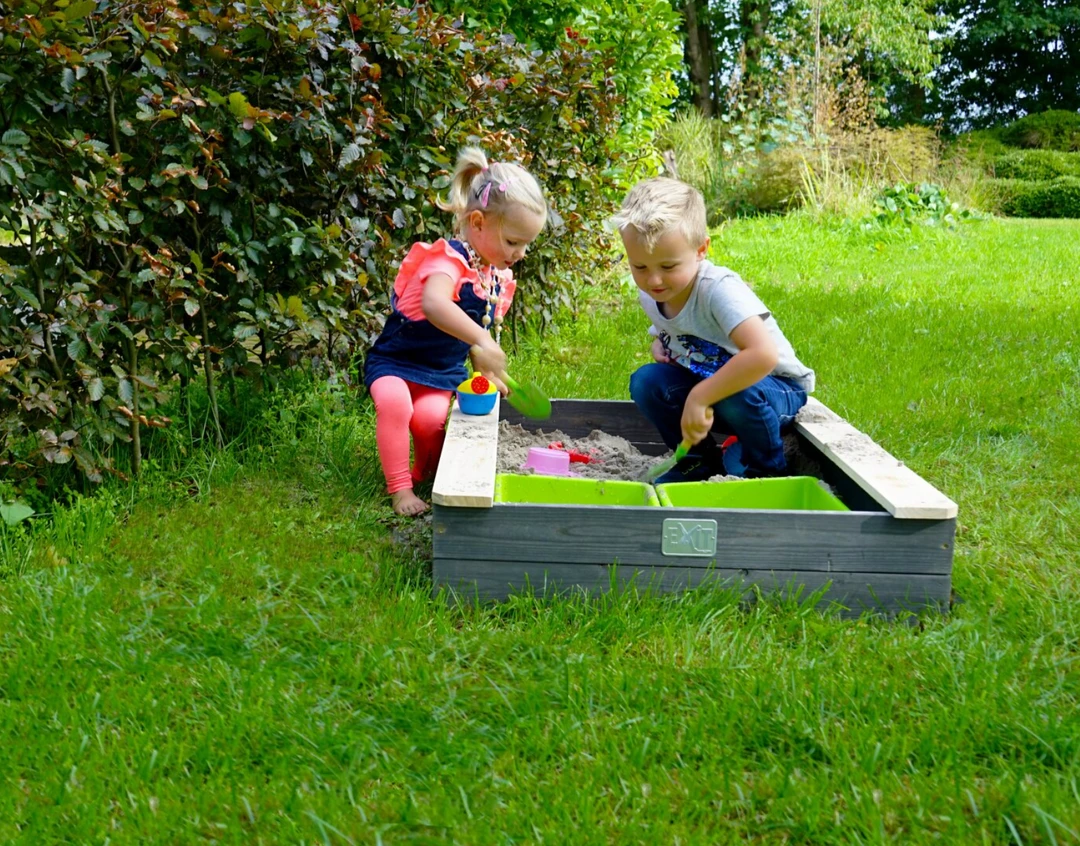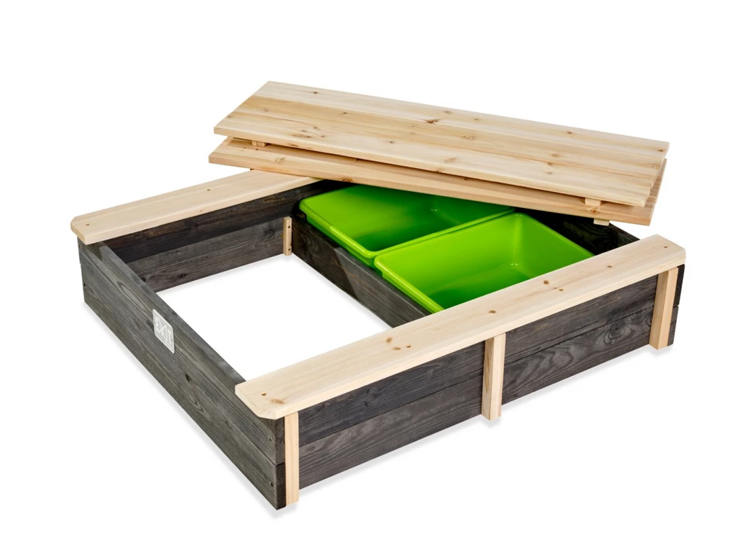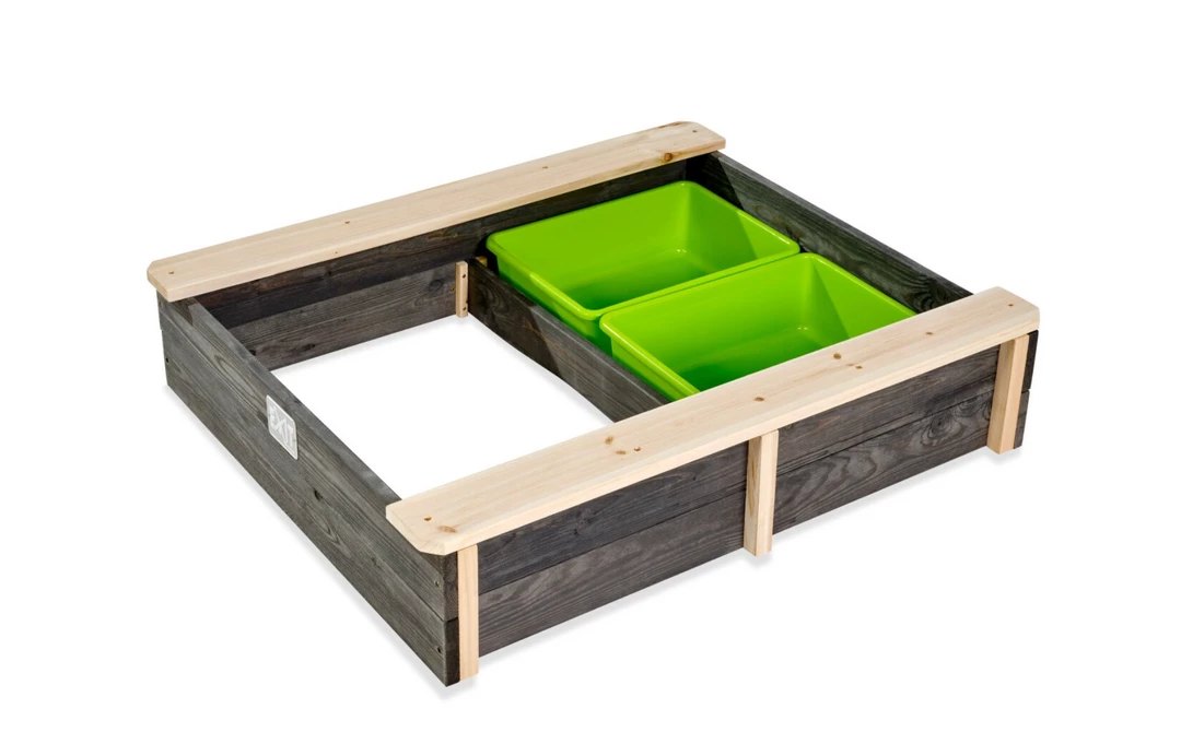 The EXIT Aksent wooden sandpit is a compact square sandpit with cover. The sandpit is equipped with two green bins which can be filled with water in the summer for great water splashing fun. Discover how mud is made from sand and water while sitting on the side benches and experience hours of fun and play. The green bins are removable, which makes them easy to empty out and clean. Have you finished playing? Then store away the toys in the bins and close the sandpit with the cover, so that the sand and toys stay nice and clean.