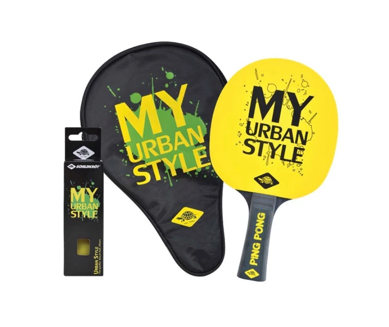 The completely new table tennis gift set “My Urban Style” from Schildkroet adds colour to the otherwise very classic table tennis game and appeals to the young audience. The set includes everything for an immediate start for a player – everything is designed to match and is the ideal gift:a high-quality leisure racket with an inside-pimple coating and a 1.2mm sponge for a good amount of acceleration. The coverings are yellow and black and are printed. The black, concave wooden handle sits comfortably and securely in the hand. In addition to the racket, the set also includes a matching racket cover with a triple ball compartment and a triple box of yellow turtle balls. Everything is packed in a blister packet.