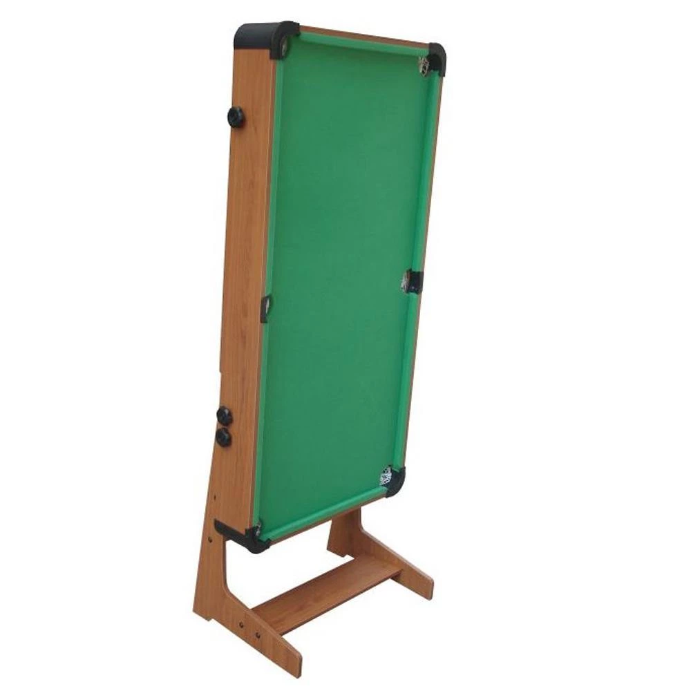 It has a modern design, with a matched wood effect finish on the table and legs, and a green cloth baize. The table bed rotates and enables vertical storage, taking up minimal space in your home.