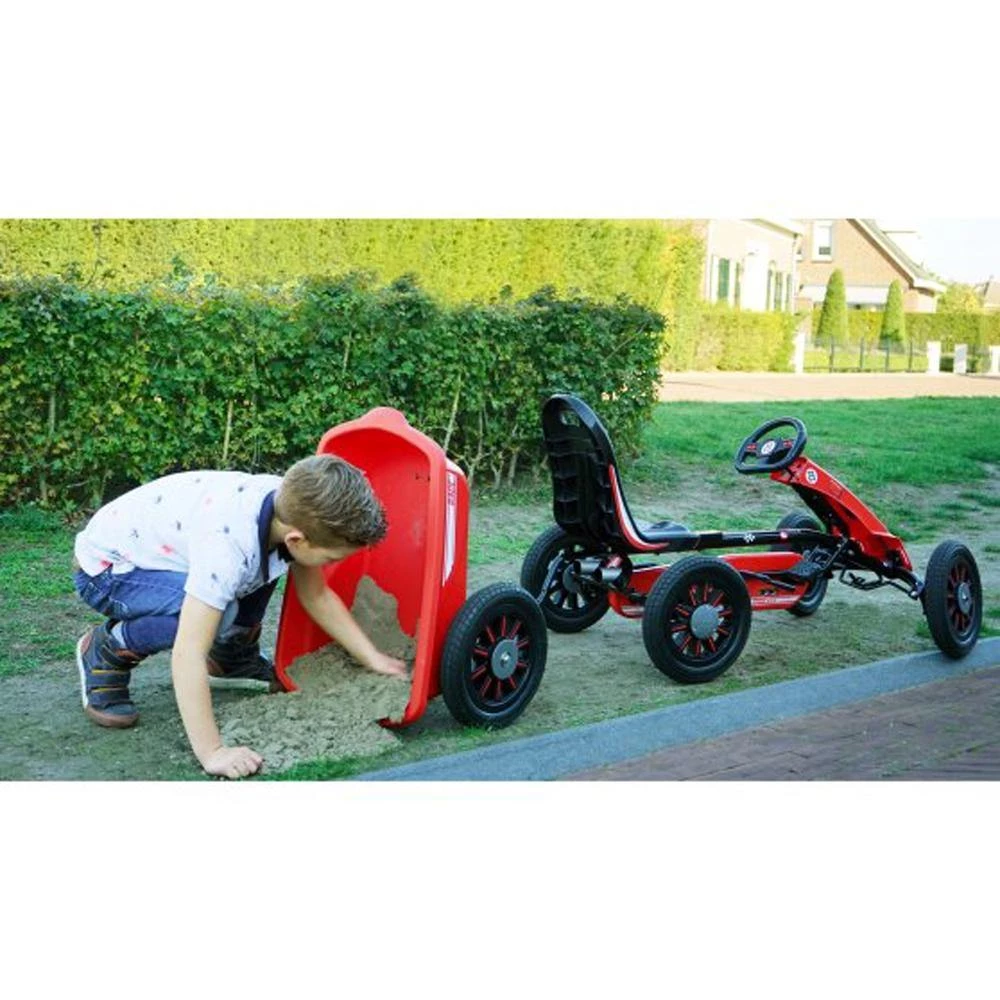 The EXIT Spider Race pedal go-kart trailer is a red trailer for the EXIT Spider pedal go-karts. The trailer is sturdy, lightweight and easy to use.