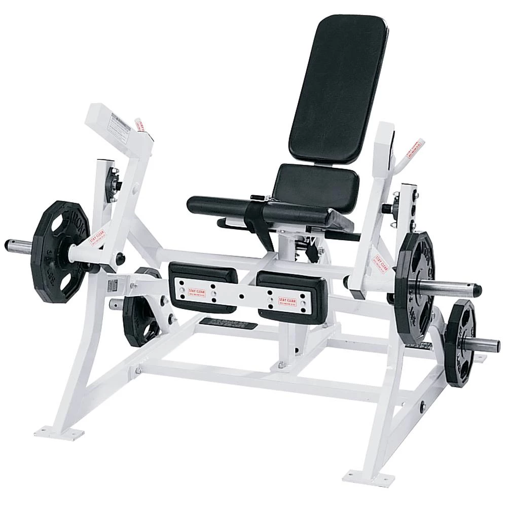 The Plate-Loaded Iso-Lateral Leg Extension was blueprinted from human movement. Separate weight horns engage independent diverging and converging motions for equal strength development and muscle stimulation variety. Two resistance loading positions provide dual strength curves depending on exercise goals.