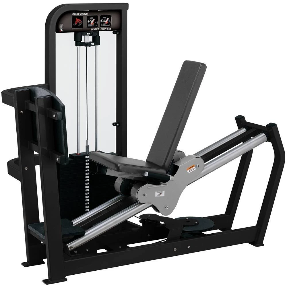 The Hammer Strength Select Seated Leg Press is a fundamental part of the strength training progression. It has biomechanically sound positioning and pressing angles, and the maintenance-free, stainless steel rails offer smooth motion. The 22 pieces in the Hammer Strength Select line provide an inviting introduction to Hammer Strength equipment.