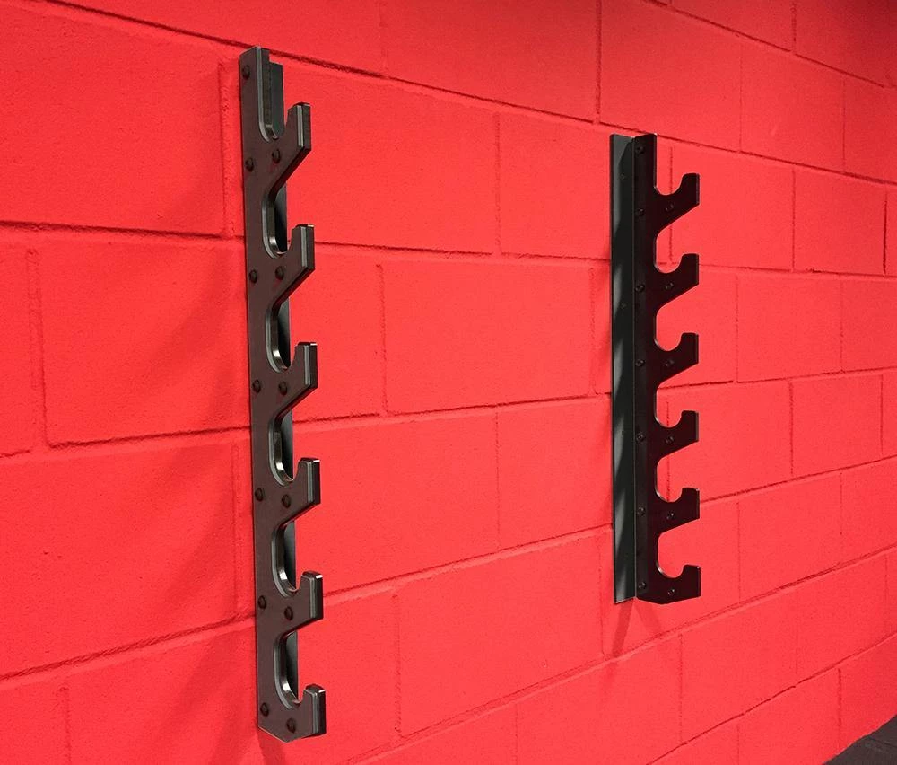 Present your Olympic bars in style with our solid steel wall mounted bar rack. Suitable for commercial gyms, Personal Trainer studios and boutique gyms.