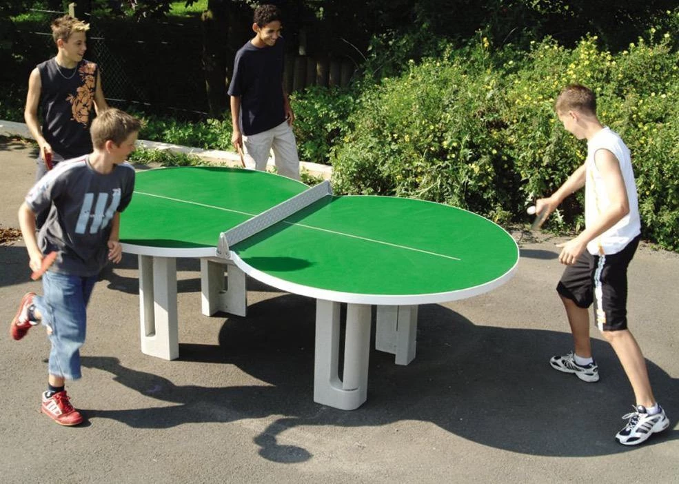 A new unique shape for fun table tennis, 25mm reinforced concrete playing top with steel cladding, 10mm thick aluminum net and post set included. Concrete leg system.Â