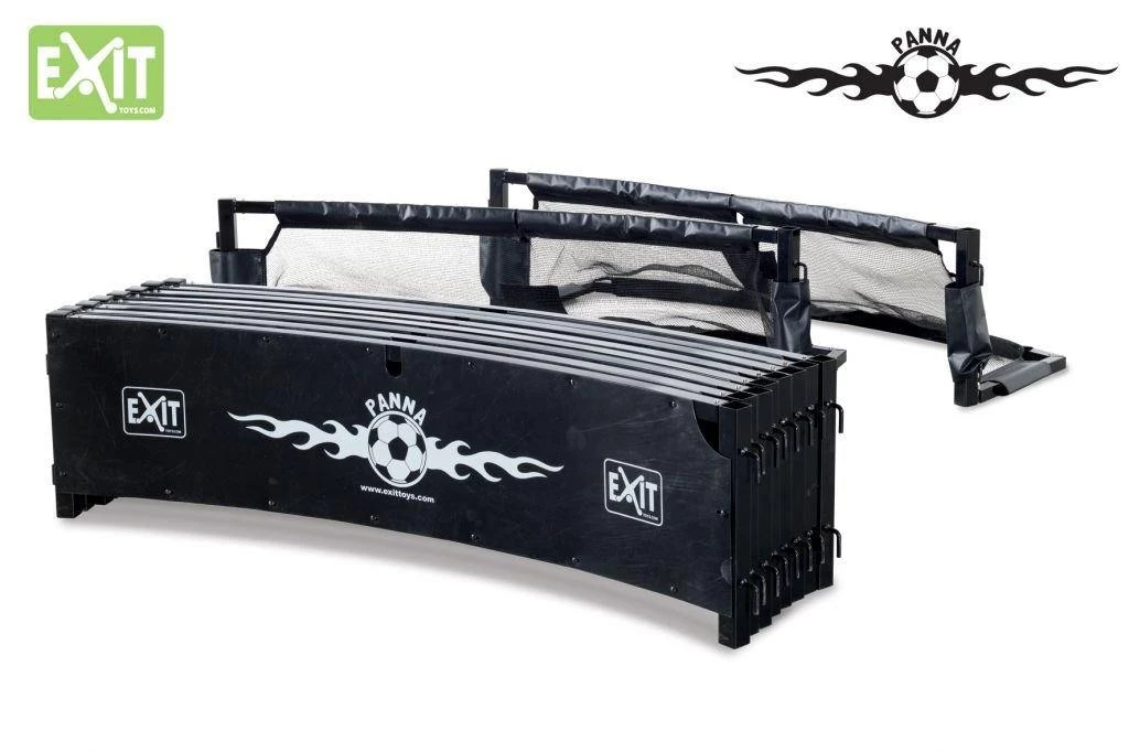 Panna fields are usually found only in public places, but with this EXIT Panna-Field, EXIT Toys has designed an affordable panna field that can be easily placed in the garden! The boarding is made of a lovely black metal frame (galvanized and powder-coated!), and the interior is cladded with black PVC panels. The boarding can be mounted and dismantled quickly, because the frame parts are hooked into each other instead of screwed. Both goals are integrated into the boarding and also equipped with a metal frame with a sturdy black net.