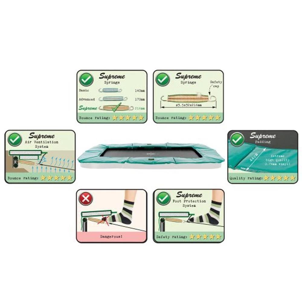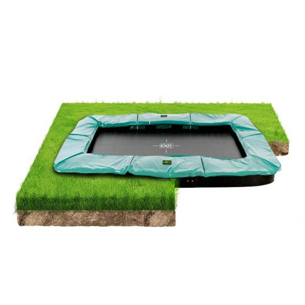 The EXIT Supreme trampoline is a rectangular trampoline of absolute top quality with green padding. To construct the EXIT Supreme, you dig a big pit in the ground so that the trampoline stands completely on ground level for a lovely and safe result. With the Supreme trampoline parents don’t have t worry about their children accidentally fall from a high trampoline.