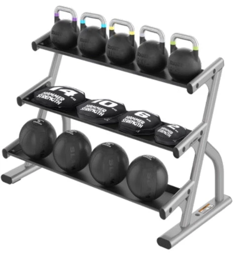 The Axiom Series Three-Tier Accessory Rack has a sleek, attractive frame with flat trays to house various accessories such as kettlebells, slam bells, wall balls, etc. in a convenient, space efficient way.