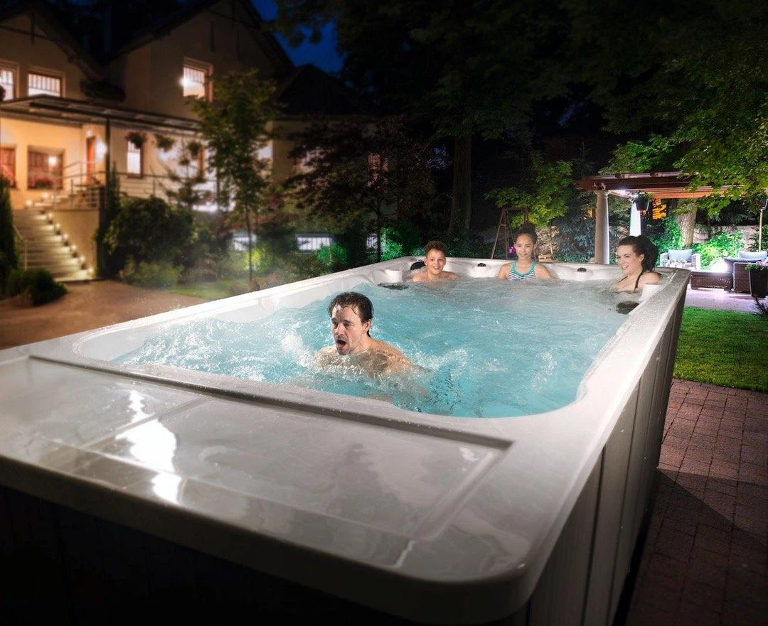 Swim Spas are increasing in popularity and bridge the gap between a hot tub and a swimming pool. They are designed for you to swim against a current of water, like a treadmill for swimming, or for fun and a splash about and there is a seated resting area too.