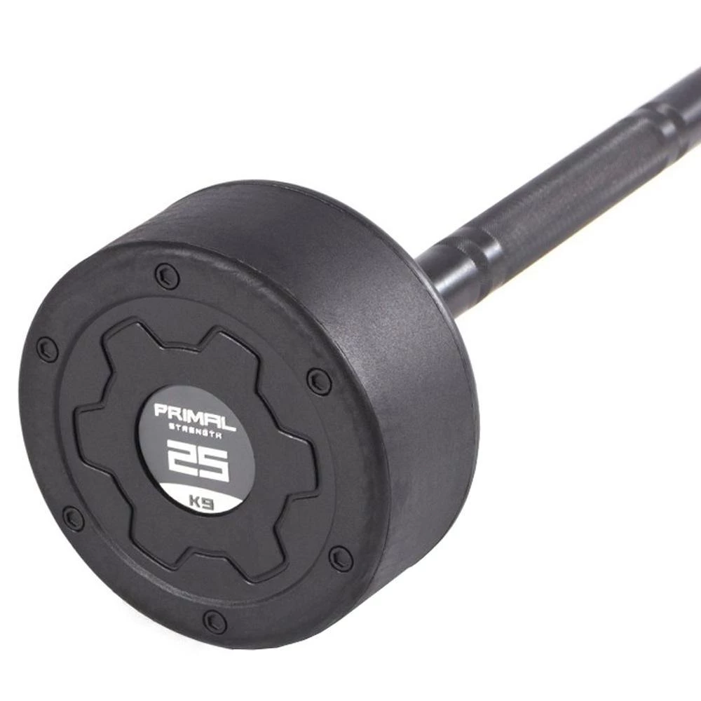 The barbells are weight-tolerance tested to within 2% to ensure accurate barbell weight. The end-caps have a subtle grey, Primal Strength logo with oversized KG numbers. The larger numbers are great to identify barbells in busy commercial gyms.