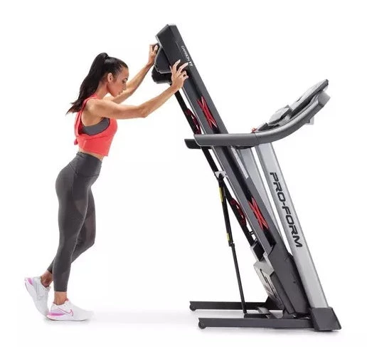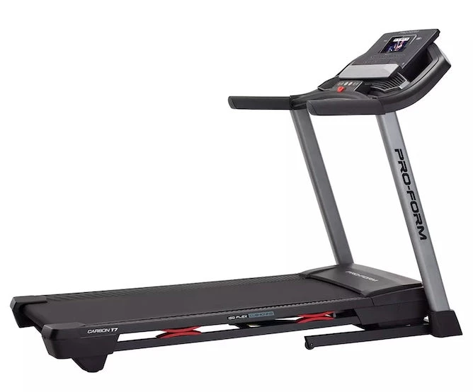 The ProForm Carbon T7i Treadmill folds up to save space when not in use. It can be easily transported due to the integrated wheels, making it perfect for home use.