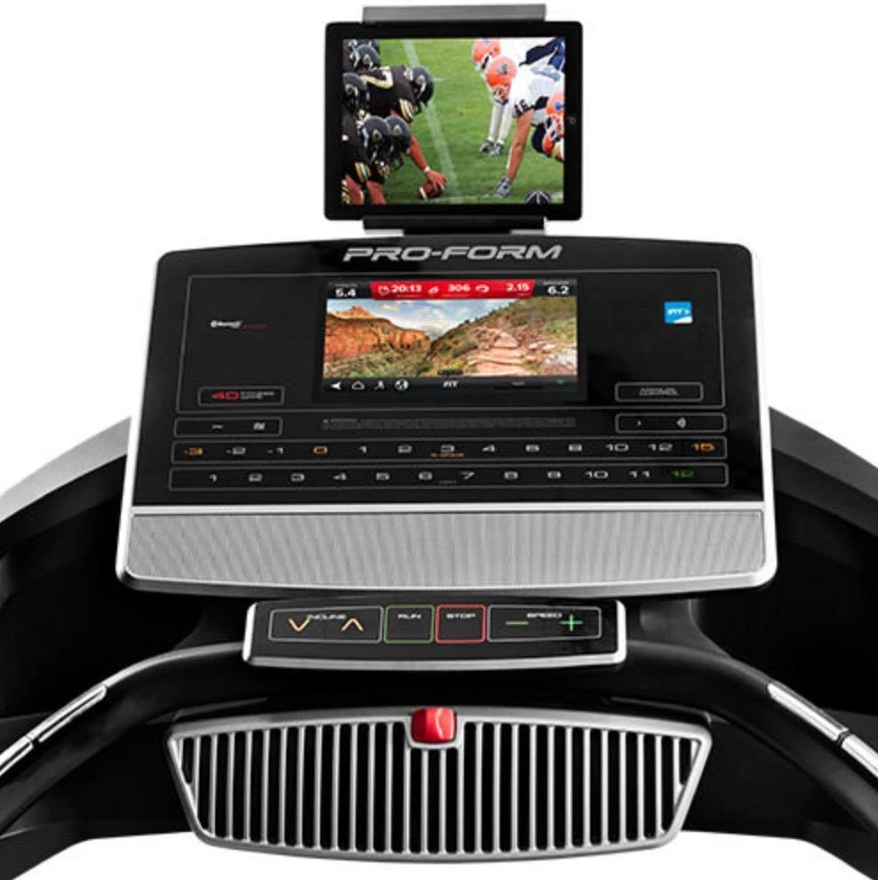 The Pro 5000 treadmill is equipped with a pivoting 10″ HD Touch Display.