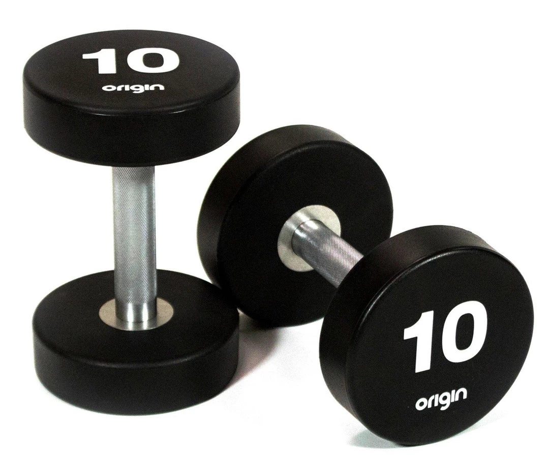 The Origin Urethane Dumbbells are sold in sets. These solid end dumbbells are a great addition to any workout area. The consistent design throughout the range is a bonus for any commercial or home gym, a the step up from the ‘Origin Pro Rubber Dumbbells’, they are built to last. Manufactured with solid steel heads, and surrounded by a thick, shock absorbent and impact resistant layer of Urethane. Easy to maintain and extremely durable.