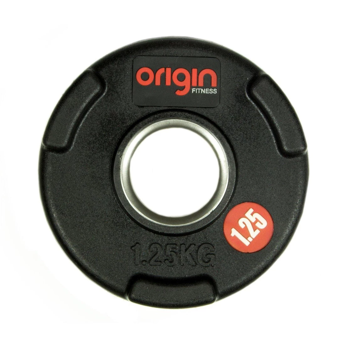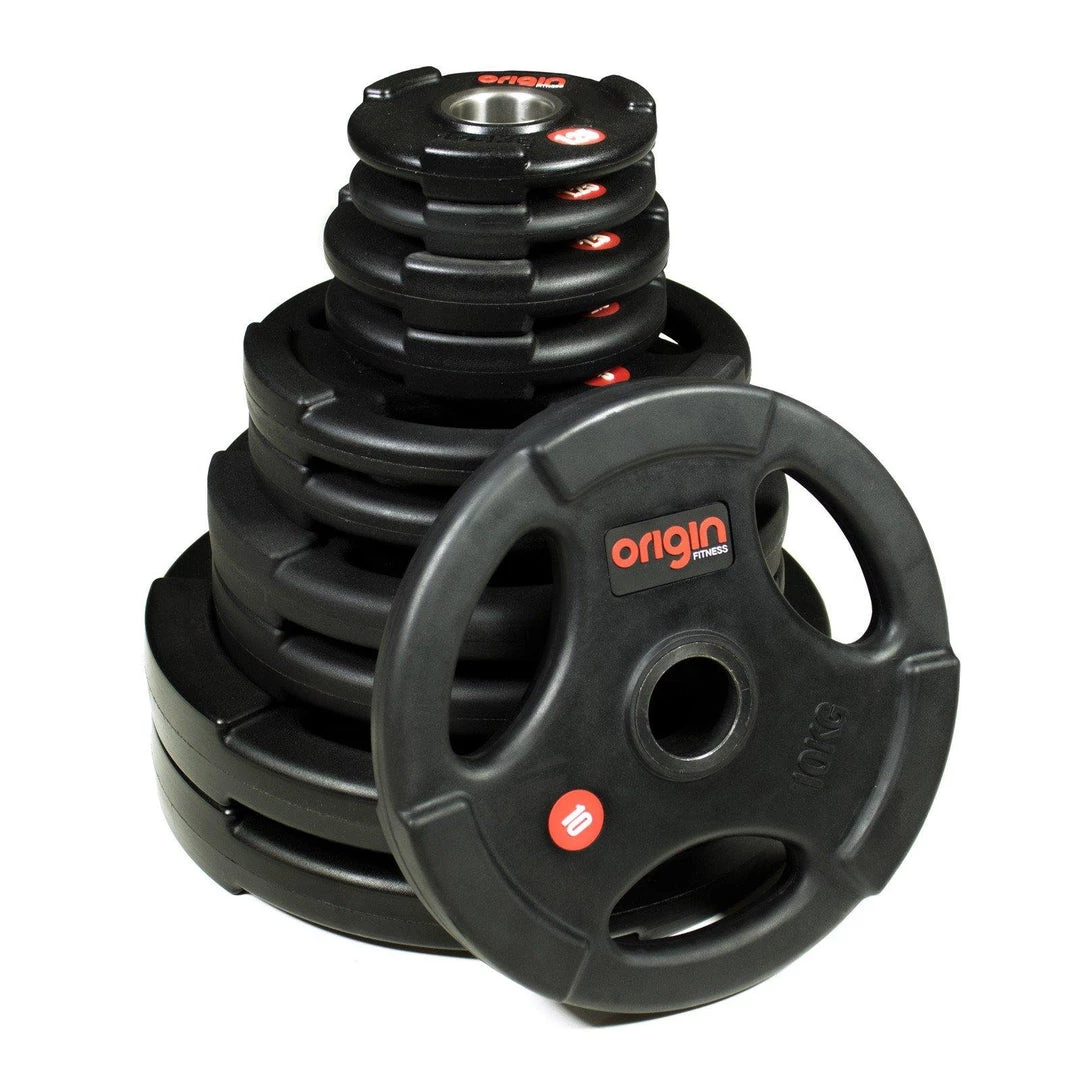 Origin Urethane Olympic Weight Plates Set consists of 4 x 20kg, 2 x 10kg, 2 x 5kg, 2 x 2.5kg, 2 x 1.25kg