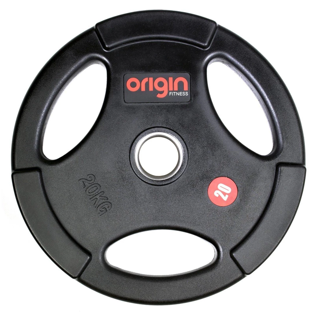 The Origin Urethane Olympic Weight Plate has a triple handle design which allows for improved grip and greater handling. This design also allows for a variety of other exercises.