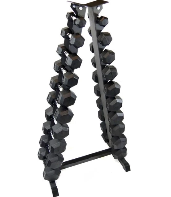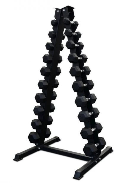 - Set includes 10 pairs of dumbbell and compact vertical storage rack