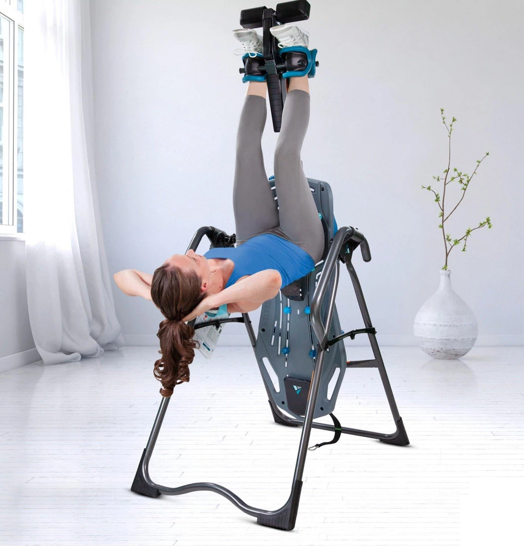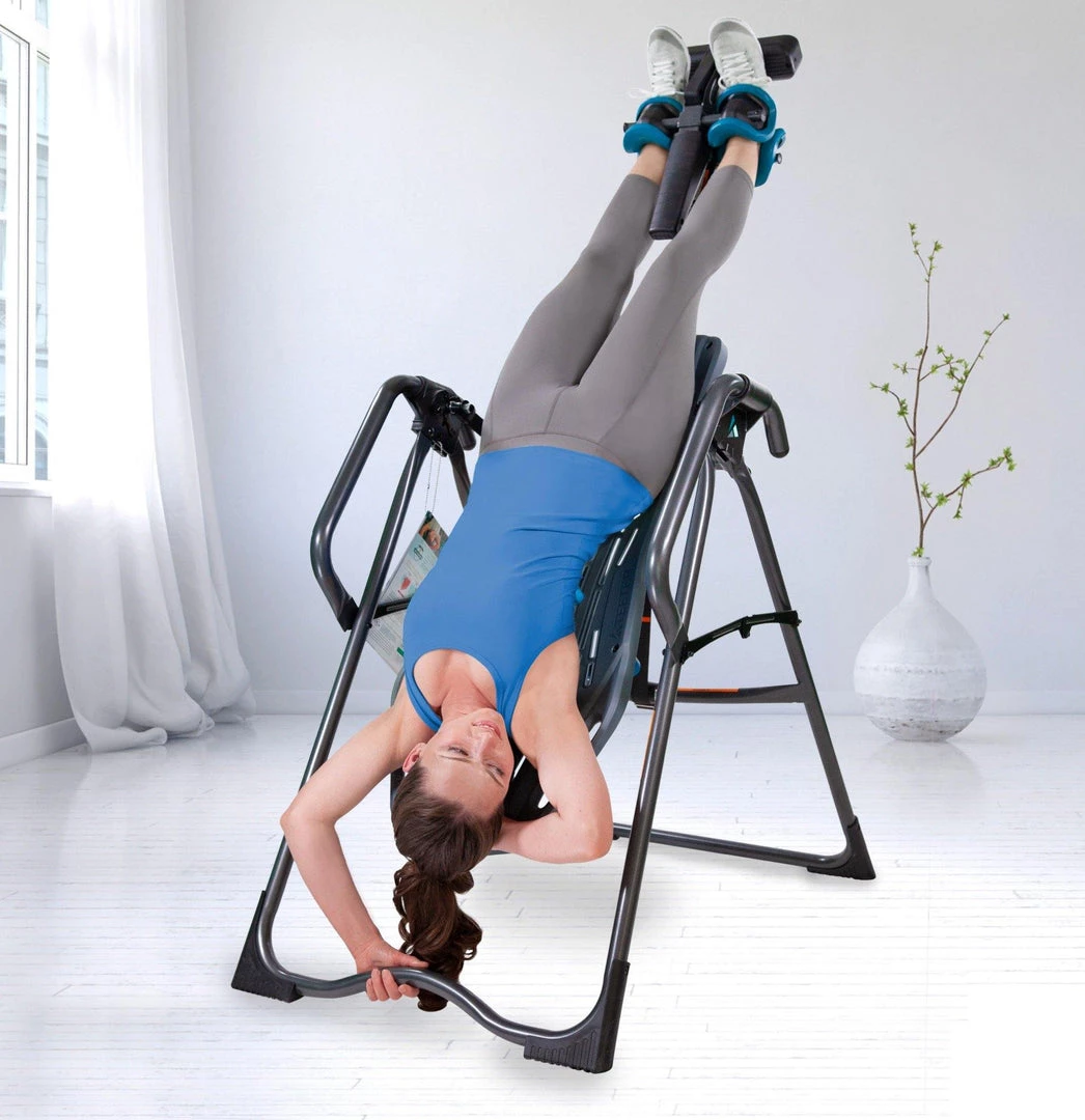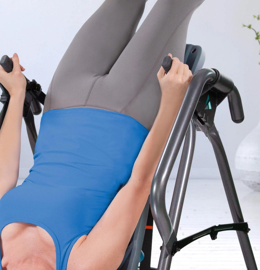The Teeter FitSpine™ X2 Inversion Table includes upgraded features and accessories to elevate and enhance your inversion experience. The innovative FlexTech™ Bed supported by an 8-point suspension system flexes as you move and enables the best decompressive stretch. Ideal for back pain sufferers, the EZ‑Reach™ Ankle System with extended handle reduces bending when securing the ankle supports. For optimum ankle comfort, patented wrap-around Ergo-Embrace Supports are made of specialty, pressure-reducing foam and the Ankle Comfort Dial lets you easily customize your fit. Large Stretch Max™ Handles provide support and assistance. With the included Acupressure Nodes and Lumbar Bridge you can modify your stretch by adding healing pressure and increased decompression.