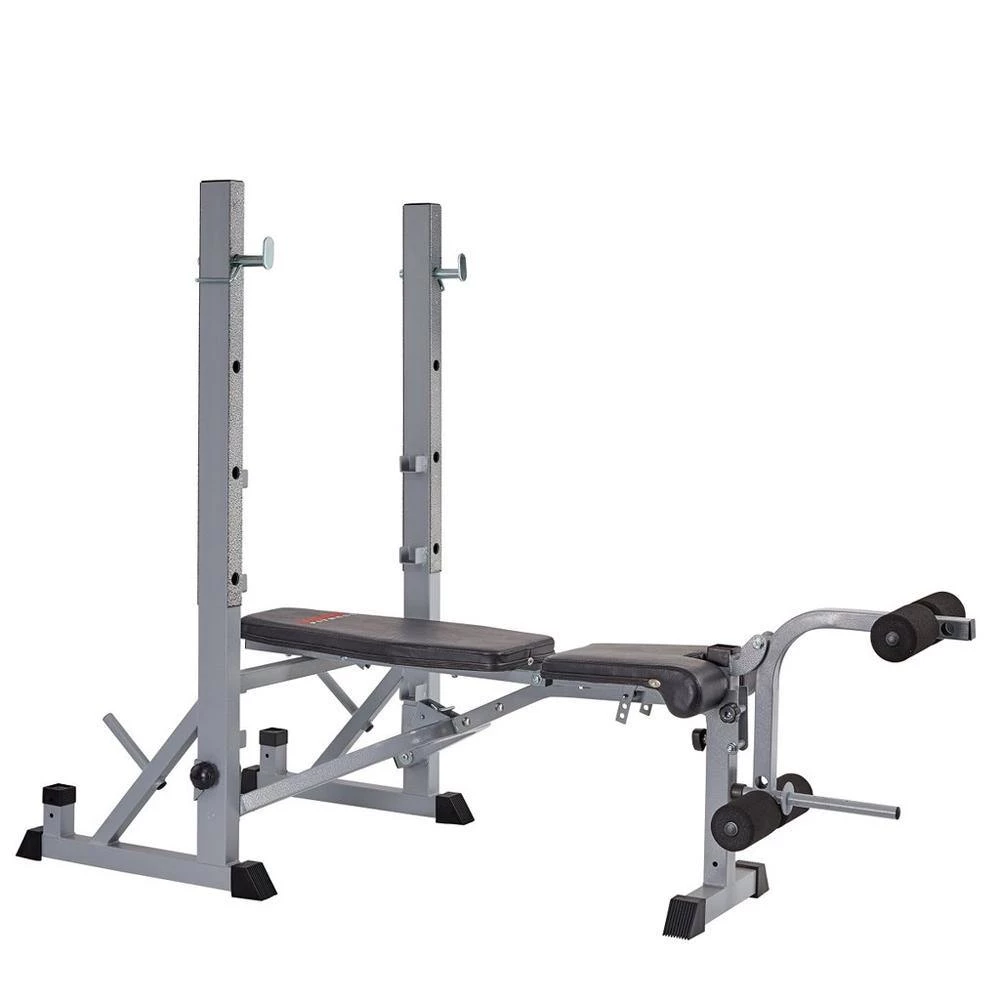 - Heavy duty uprights double up as a squat rack.
