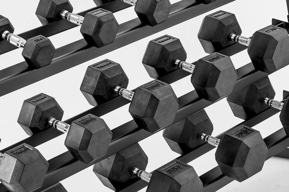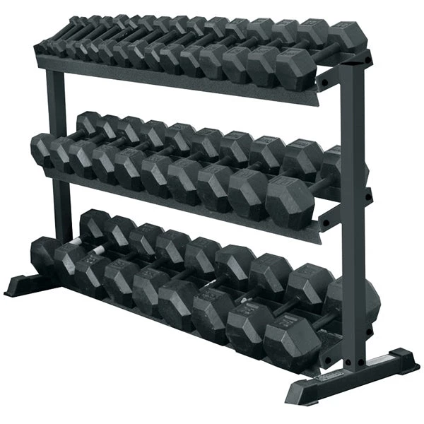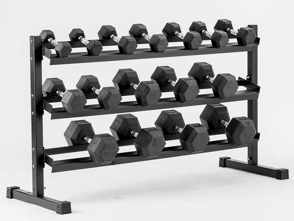 York Heavy-duty three tier rack holds iron hex dumbbells from 5 lb to 80 lbs in 5 lb increments